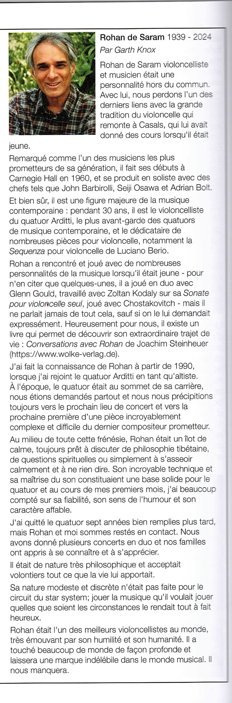 "Rohan a rencontré et joué avec de nombreuses personalités de la musique lorsqu'il était jeune - pour n'en citer que quelques-unes, il a joué en duo avec Glen Gould, travaillé avec Zoltan Kodaly sur sa Sonate pour violoncelle seul, joué avec Chostakovitch ...